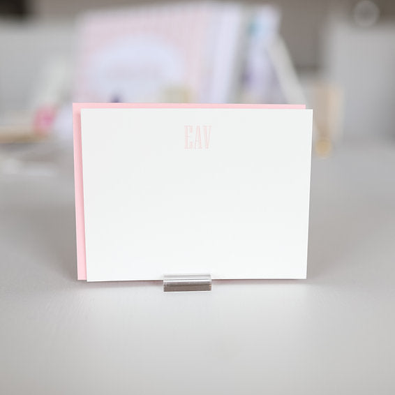 Pictured is a soft white card with candy pink ink and envelope with a block (all caps) Monogram